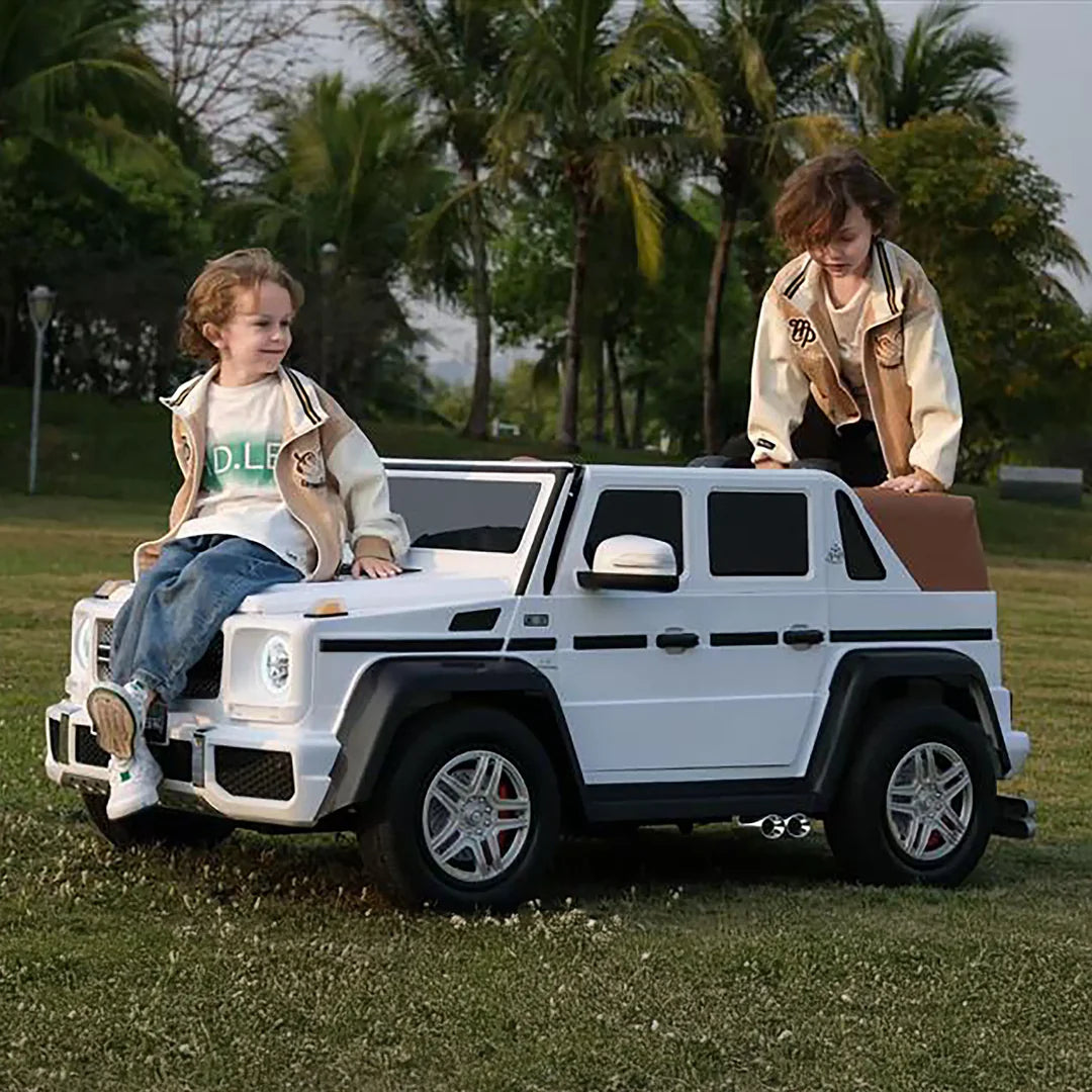 Let your child experience the pinnacle of luxury with the Mercedes-Benz G-Wagon Maybach! This 2-seater, 24V ride-on is perfect for kids aged 6 and up. It features LED lights for a realistic look, a powerful brushless motor for effortless cruising, and a comfortable leather seat for a truly luxurious experience.